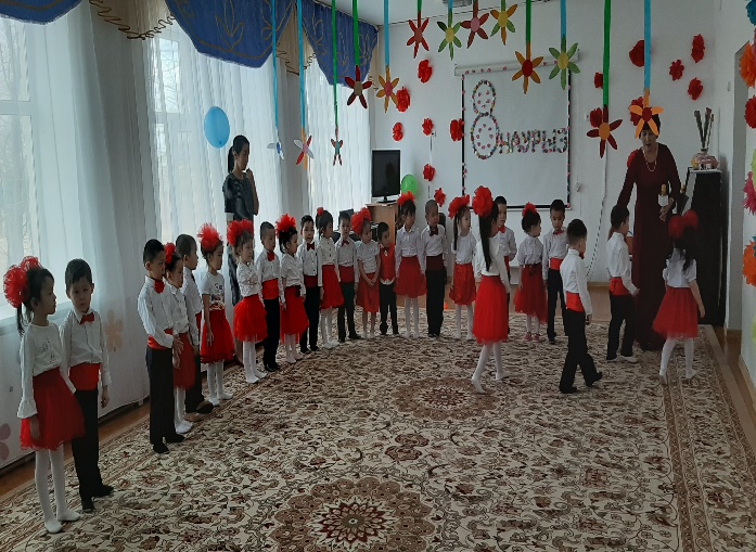 Мақсаты: Балаларға 8 – наурыз халықаралық мейрамы екенін ұғындыра отырып, аналарын ешқашан ренжітпеуге, қолғанат болуға, әрқашан құрметтей білуге тәрбиелеу. Өнерге деген қызығушылығын ояту және сөздік қорларын байыту.