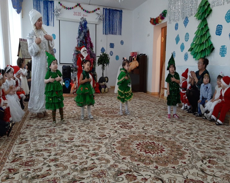 2020 жылды қарсы алу Жаңа жыл қарсаңында «Қош келдің Жаңа жыл» атты мерекелік ертеңгілік бөбекжайдың 6 тобында өтті.Балаларды жасыл шыршамен таныстырып, жаңа ән айтқызу арқылы мерекелік көңіл- күй сыйлау.Балалар жасыл шыршадан шеңбер болып айналып жүріп, еркін би билеп ән айтты.